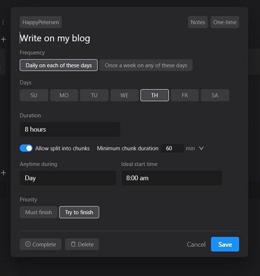 As you can see, I try to do this blog every Thursday. I had to move to a new house this week, so I didn't get time before Sunday. So I have set this task to an 8-hour duration but allowed Motion to slit it into chunks of at least 60 minutes. 60 minutes is the least I want to work at a time on this project, as it requires some start-up time to get into the right mind-space to write good content. I have set it to "try to finish" so that if I have other more important tasks, it will not overwrite.